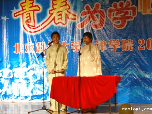 决赛当晚气氛热烈,吸引了众多观众到场观看并为所支持的表演队加油鼓劲。开场先播放了五分钟的视频短片,短片展现了各表演队伍以及工作人员前期的辛勤准备以及和睦团结的氛围。决赛第一组是由法律系杨天宇、武铮表演的《西征梦》,经典的郭德纲段子由两位参赛选手表现的惟妙惟肖,台下更是笑声不断。接下来上场的是经济系崔慧敏、张倩、魏长宁表演的《小张说事》,突出的创意和生动的表演让观众流连忘返,其中由魏长宁同学表演的小沈阳更是魅力十足神气活现。