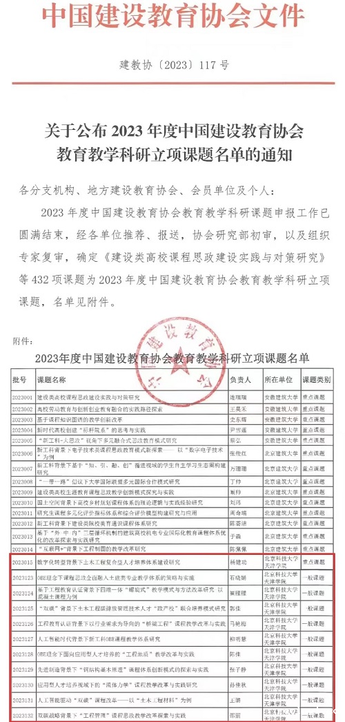 近日,2023 年度中国建设教育协会教育教学科研课题申报工作已圆满结束,经学院推荐、报送,协会研究部初审,以及组织专家复审,2023 年度中国建设教育协会教育教学科研立项课题已公布,城建学院教师申报的课题中,成...